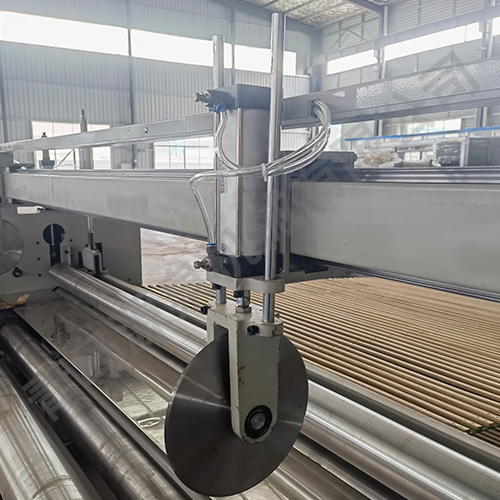 該機(jī)器采用飛刀切割或電熱絲方式橫切,并配有四把縱切切刀,其主要用于將噴膠棉、無膠棉、硬質(zhì)棉等進(jìn)行切邊、收卷并裁剪成符合要求的尺寸規(guī)格。本機(jī)具有計(jì)數(shù)功能、跟蹤橫切功能。